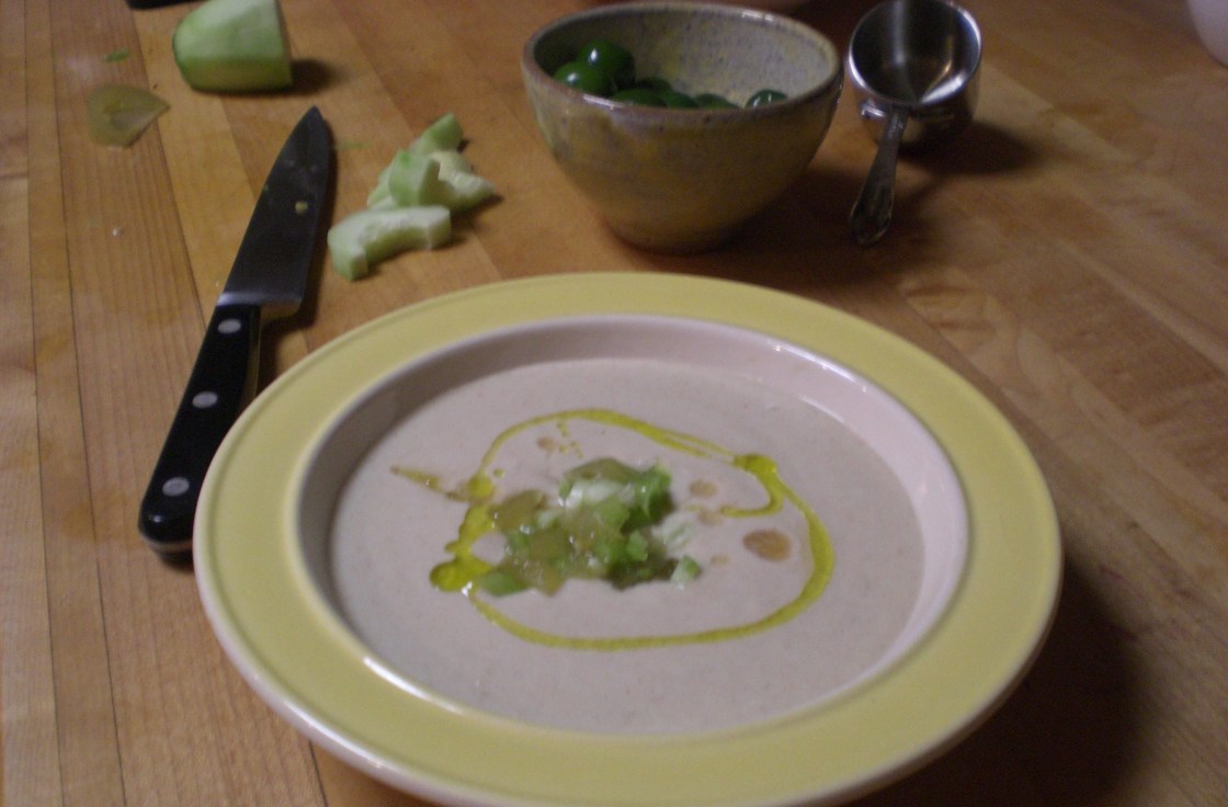 This version cheats on the no-tomato bit – I add just a little green tomato to brighten the thick soup. Your degree of thickness will depend upon the strength of your artisan bread maker’s starter and your grape. Don’t worry; you can always thin with a little filtered water or seltzer (the bubbles give it a nice little tang, without changing the flavor). You might even try thinning with the white wine you are drinking, but I find that the drier the wine, the better the soup and this one requires a wine with more heft.