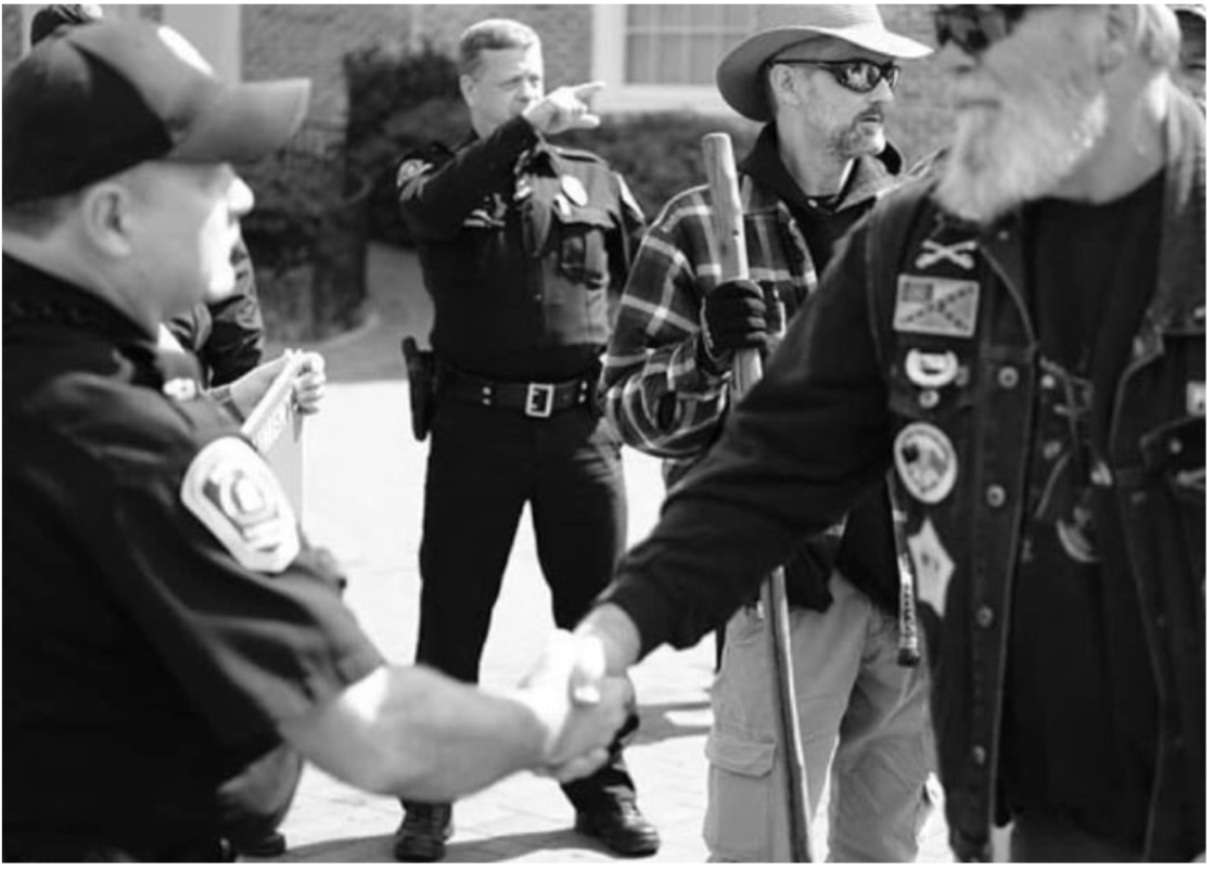 The story that hails me has several functions: to draw together everyday southern-loving people into a collective story; to convey shared intimacy of both purpose and culture, and perhaps most importantly, to continue the subtle handshake between southern persons, in particular, like that casual handshake between a police officer and an armed Heirs to the Confederacy protesters on our campus. A handshake, a gentle (man’s) agreement between like-minded individuals. But what does this handshake require from Black people? It requires that we endure in the everyday; that we join the pernicious social contract that sees grievous error and bodily harm as harmless gaff. Four hundred years of looking away has conditioned us to accept the green dress in Gone with the Wind and not the plantation and the window on which those curtains hang. In the pages of so many “southern” magazines I see what are called “former” plantations resplendent with the gardens Black persons tended and the irrigation systems they constructed to make rice, sugar, tobacco and cotton thrive. It is time for us to call the plantation not what it should be to us today, but what it has always been: theft of Indigenous land, the making of human being into machine, the space from which our “democracy” was thwarted and born, all at once; an awful simultaneity.